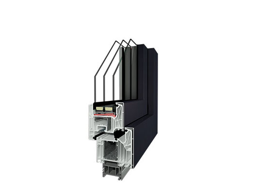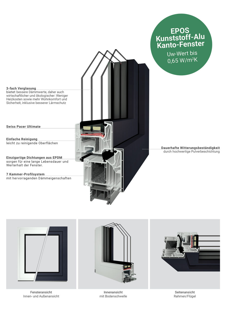 Beim Bruckner Fenster Kunststoff-Alu Epos Kanto ist das Fensterprofil innen versetzt ausgeführt, die Alu-Außenschale wird kantig versetzt.